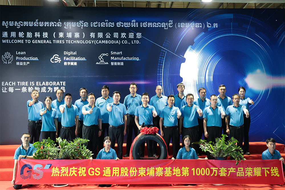 5月6日,通用股份柬埔寨基地迎來歷史性時刻。在半鋼硫化車間內(nèi),千里馬品牌275 55R20 PREVAIL H T輪胎緩緩誕生,標志著基地第1000萬條輪