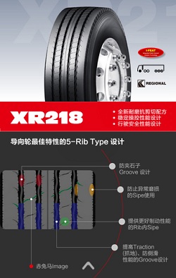 其中XR218采用全新耐磨抗剪切配方,更加穩(wěn)定的操控性能設(shè)計(jì),以及保障行駛安全性能設(shè)計(jì)。其導(dǎo)向輪采用了5—Rib Type設(shè)計(jì),包括防夾石子Groove設(shè)計(jì);防止異常磨損的Sipe使用;提供更好制動性能的Rib內(nèi)Sipe;以及提高Traction(抓地)、防側(cè)滑性能的Groove設(shè)計(jì)。