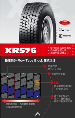 XR576使用耐磨抗剪切配方、均勻接地壓力設(shè)計(jì)以及優(yōu)異的驅(qū)動性設(shè)計(jì),寬胎面的設(shè)計(jì)為車輛提供更好的驅(qū)動抓地性能。同時(shí)采用更加穩(wěn)定的6—Row Type Block花紋設(shè)計(jì),包括防夾石子Groove 設(shè)計(jì);赤兔馬Image;防止高低臺磨損的Tie—Bar應(yīng)用。