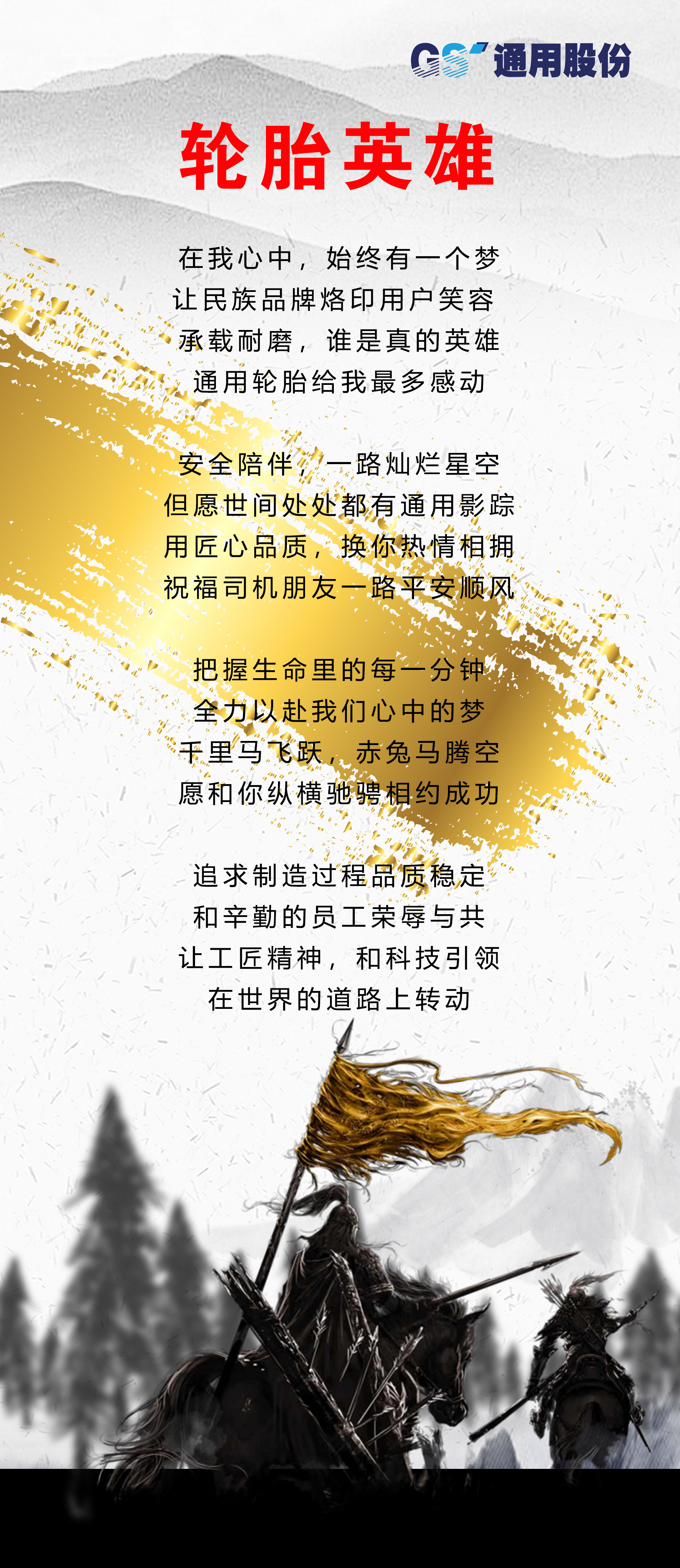 今年9月是中國(guó)第四十一個(gè)“質(zhì)量月”,也是通用股份第十四屆“科技質(zhì)量月”。滄海橫流,自強(qiáng)不息,方顯英雄本色。今年,通用股份以一首創(chuàng)編的《輪胎英雄》拉開了“科技質(zhì)量月”的帷幕,在這個(gè)風(fēng)起云涌的競(jìng)爭(zhēng)時(shí)代,全體通用人堅(jiān)守初心,以振興民族品牌為己任,為向廣大消費(fèi)者提供更加卓越的產(chǎn)品與服務(wù)而不斷努力奮斗,推動(dòng)企業(yè)邁向高質(zhì)量發(fā)展。